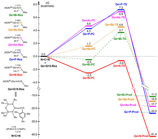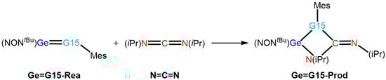 Figure 2 presents the free energy profiles for the [2 + 2] cycloaddition reactions of heavy imine-like Ge=G15-Rea molecules with N=C=N (Equation (1)), computed at the M06-2X-D3/def2-TZVP level. The calculated energy profile for the reaction sequence Ge=G15-Rea + N=C=N → Ge=G15-PC (precursor complex) → Ge=G15-TS → Ge=G15-Prod, is also illustrated in Figure 2. The geometrically optimized structures of Ge=G15-Rea, Ge=G15-TS, and Ge=G15-Prod can be found in Figure 3.