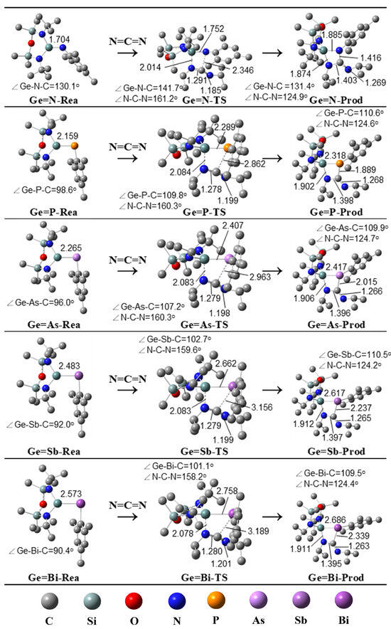 The structures of the reactants (Ge=G15-Rea), transition states (Ge=G15-TS), and products (Ge=G15-Prod) in the gas phase for the cycloaddition reactions with N=C=N were optimized using the M06-2X-D3/def2-TZVP method. Bond lengths and bond angles are expressed in angstroms (Å) and degrees (°), respectively.