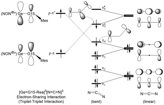 The “electron-sharing bonding model”, also known as the “triplet–triplet interaction model”, can be represented by the reaction: [Ge=G15-Rea]3 + [N=C=N]3 → [Ge=G15-TS]1. * means anti-bonding.