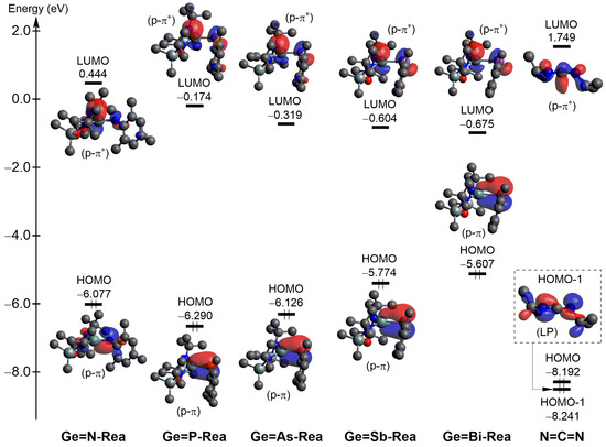 A schematic representation of the essential frontier molecular orbitals and their orbital energies (in eV) is provided for five heavy imine analogues, Ge=G15-Rea and N=C=N, with hydrogen atoms excluded for clarity. * means anti-bonding.