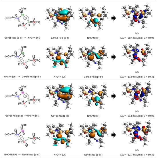 The EDA method was used to perform a quantitative analysis of the bonding interactions between the heavy imine-like fragment (Ge=G15-Rea) and dicyclohexylcarbodiimide (N=C=N, Scheme 2). The interaction energy (∆EINT) was further broken down into several physically relevant contributions.