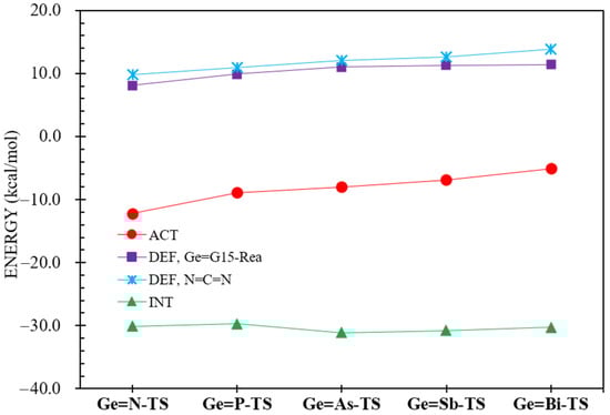 The activation energy (ΔEACT) decomposition for the transition states (Ge=G15-TS) in the [2 + 2] cycloaddition reactions between Ge=G15-Rea and N=C=N, with data extracted from Table 4.