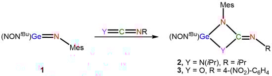 The [2 + 2] cycloaddition of heterocumulenes (2 and 3) with [(NONtBu)Ge=N–Mes] (1, NONtBu = O(SiMe2NtBu)2 and Mes = 2,4,6-Me3C6H2). See references [42,43].