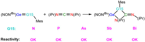 As seen in Figure 2, the computed Gibbs free activation energies (ΔGACT) for heavy imine-like Ge=G15-Rea species are within −0.6–7.2 kcal/mol, suggesting relatively low barriers compared to the corresponding precursor complex, Ge=G15-PC. Meanwhile, their reaction free energies (ΔGRXN) remain negative (−41.4 to −11.0 kcal/mol), demonstrating a thermodynamically favorable process. More precisely, our M06-2X-D3 computations, presented in Figure 2, reveal that the Gibbs free activation barriers (ΔGACT, kcal/mol) increase relative to Ge=G15-PC in the order: Ge=N-TS (1.9) < Ge=P-TS (2.4) < Ge=As-TS (2.7) < Ge=Sb-TS (2.9) < Ge=Bi-TS (4.2). Additionally, the Gibbs free reaction energies (ΔGRXN, kcal/mol) for the [2 + 2] cycloaddition between N=C=N and Ge=G15-Rea exhibit an increasing trend: Ge=N-Prod (−41.4) < Ge=P-Prod (−23.2) < Ge=As-Prod (−17.7) < Ge=Sb-Prod (−14.9) < Ge=Bi-Prod (−11.0). Our computational findings indicate that the free activation and reaction energies exhibit a trend dictated by the atomic number of the Group 15 element. Specifically, in the Ge=G15-Rea system, a higher atomic number of G15 corresponds to an increased activation barrier, making the [2 + 2] cycloaddition reaction with N=C=N less exergonic. Until now, only one experimental study has supported our M06-2X prediction that the Ge=N-Rea molecule [42,43], possessing a Ge=N double bond and resembling a heavy imine, can undergo this reaction with ease (Scheme 1).