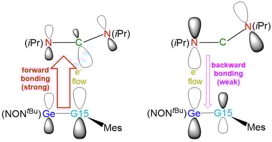 The “singlet–singlet interaction model” shown in Figure 4 is represented by [Ge=G15-Rea]1 + [N=C=N]1 → [Ge=G15-TS]1 and is also referred to as the “donor–acceptor bonding model.” Its stability is derived from two major interactions: (the filled p-π orbital of Ge=G15-Rea) → (the LUMO of N=C=N) and (the vacant p-π* orbital of Ge=G15-Rea) ← (the HOMO of N=C=N).