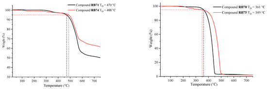 The thermal characteristics of the prepared objective derivatives RB71, RB74, RB70, and RB75 were established in a nitrogen atmosphere using differential scanning calorimetry (DSC) and thermogravimetric analysis (TGA). The curves of the TGA of these materials are demonstrated in Figure 1. The obtained results revealed that all these compounds have very high thermal stability. The temperatures of 5% weight loss (Td) for the prepared derivatives were, correspondingly, 470 °C for RB71, 488 °C for RB74, 361 °C for RB70, and 349 °C for RB75, as confirmed by the analysis using a heating rate of 10 °C/min. It could be seen that the materials RB71 and RB74 exhibited obviously higher values of Td than those of derivatives RB70 and RB75. This could be explained by the higher molecular weight of the branched molecules having three carbazole rings. The TGA curves of RB70 and RB75 demonstrate that these materials incur thermal evaporation during the experiment due to their lower molecular weight. Furthermore, it is essential to note that all the materials exhibited very high performance for their application in the thin layers of optoelectronic devices [40,41,42].