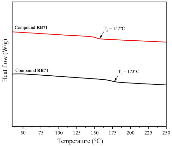 The derivatives with three carbazolyl fragments, RB71 and RB74, were obtained as amorphous materials after synthesis and purification by column chromatography, as confirmed by DSC measurement. The thermograms registered for the compounds RB71 and RB74 during their second heating cycle are presented in Figure 2. It is evident that these materials have very high glass transition temperatures (Tg), which reach 157 °C for the derivative RB71 and 173 °C for the material RB74. The high values of Tg are a significant advantage for the fully amorphous derivatives, with potential application in forming thin homogeneous electroactive layers in OLEDs, as they contribute to the enhanced long-term stability of the devices [43,44,45].