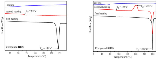 The lower molecular weight derivatives RB70 and RB75 with two carbazole rings showed different thermal transitions than those of the aforementioned fully amorphous materials. First, both compounds were obtained as crystalline materials after synthesis and purification by column chromatography; however, they could be transformed into amorphous materials by cooling the melted samples, as confirmed by the DSC experiments. The thermograms of the derivatives RB70 and RB75 are shown in Figure 3. When the crystalline material RB70 was heated, an endothermic peak was observed at 171 °C due to melting. Then, the melted sample was cooled down and converted into an amorphous material. During the second heating of the sample, only the glass transition temperature was registered at 68 °C, and upon further heating, the sample showed no peaks associated with crystallization or melting. The derivative RB75 demonstrated a stronger tendency for crystallization. Firstly, an endothermic peak due to melting was observed at 280 °C when the crystalline sample was heated for the first time. Then, the melted sample was cooled down and converted into an amorphous material. During the second heating of the sample, the glass transition temperature was observed at 105 °C, followed by crystallization at 201 °C to form the same crystals, which were obtained by crystallization from the solution and melted at 280 °C. It could be stated that the thin amorphous films of the materials RB70 and RB75 will be less stable than those of the branched derivatives RB71 and RB74; however, such materials demonstrating the formation of an amorphous phase in DSC measurements were also successfully applied as electroactive layers in OLED devices [46,47,48].