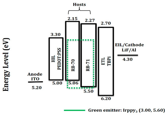 The energy level diagram in eV of the solution-processed green phosphorescent OLEDs containing hosts RB71 or RB70 with the phosphorescent emitter Ir(ppy)3.