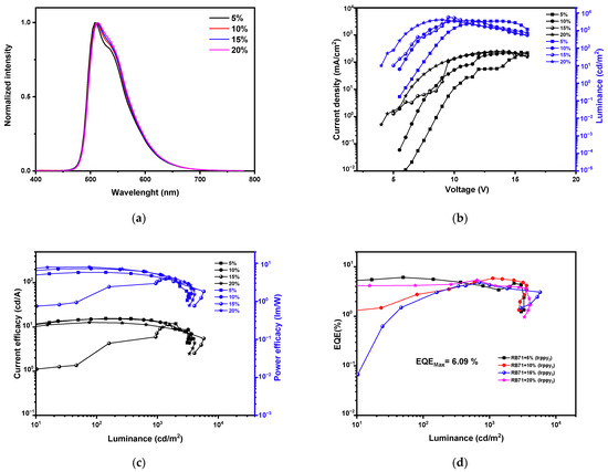 The electroluminescent (EL) properties of the devices using the new hosts RB71 or RB70 with 5.0, 10.0, 15.0, and 20.0 wt.% concentrations of dopant Ir(ppy)3 were demonstrated. Figure 5 illustrates the electroluminescence spectra, current density–voltage–luminance, current efficacy–luminance–power efficacy, and external quantum efficiency–luminance characteristics of the OLEDs using the host material RB71. Some characteristics of these devices are also summarized in Table 1. The registered EL spectra (Figure 5a) exhibit very similar emission peaks for different doping concentrations in the RB71 host-based devices. All the PhOLEDs emit light at about 515 nm due to the emissions of Ir(ppy)3. They do not have any color shift while changing the concentration of the green-emitting dopant. The fabricated devices emitted green light with CIE coordinates of (0.30, 0.61) and broad spectra from 460 to 700 nm. The presence of the single emission peak indicates the complete host–guest energy transfer and confirms that this host is well suited for the Ir(ppy)3 dopant.