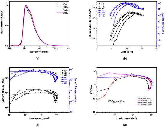 Characteristics of OLEDs using host material RB71 with different concentrations of emitter Ir(ppy)3. (a) Electroluminescence spectra, (b) current density–voltage–luminance, (c) current efficacy–luminance–power efficacy, (d) external quantum efficiency–luminance.