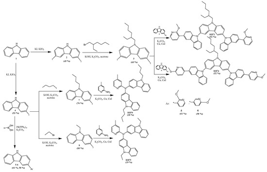 The objective compounds 9-(2-ethylhexyl)-3,6-di [3-(methoxypyridin-3-yl)carbazol-9-yl]carbazoles RB71 and RB74 were finally synthesized by the Ullmann coupling reaction between the 9-(2-ethylhexyl)-3,6-diiodocarbazole (3) and corresponding 3-(methoxypyridin-3-yl)-9H-carbazole (5 or 6). Other target derivatives, 9-alkyl-3-[N-(9-alkylcarbazol-3-yl)-N-(4-methylpyridin-2-yl)amino]carbazoles RB70 and RB75, were also prepared according to the Ullmann reaction method from 2-amino-4-methylpyridine and corresponding 3-iodo-9-alkylcarbazole (7 or 8). Mass spectrometry (MS) and nuclear magnetic resonance spectroscopy (NMR) confirmed the newly prepared derivatives’ structures. The data showed good agreement with the proposed structures.