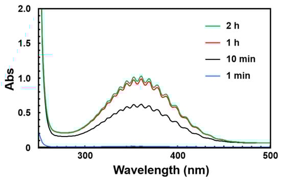 ClO2• is produced in an aqueous solution through the reaction between NaClO2 and HCl, resulting in a yellow solution (Equation (1)) [17,18]. Its ultraviolet–visible (UV–Vis) absorption spectrum exhibits a prominent peak at 358 nm [19,20], facilitating the spectroscopic confirmation of ClO2• formation. This study investigated the potential production of ClO2• in an organic solvent. Amounts of 57 mg of 0.50 mmol NaClO2, 400 μL of 0.40 mmol HCl in ethyl acetate (EtOAc), and 600 μL of acetonitrile (MeCN) were mixed and stirred at 25 °C for varying durations: 1 min, 10 min, 1 h, or 2 h. Subsequently, the supernatant was diluted twenty-fold, and UV–Vis spectroscopy was conducted at 25 °C (Figure 1). A slight ClO2• absorption was observed at 1 min, while a distinct absorption at 358 nm appeared by 10 min, reaching maximum intensity within 1 h. The spectrum remained constant at 2 h, indicating completion of the reaction.