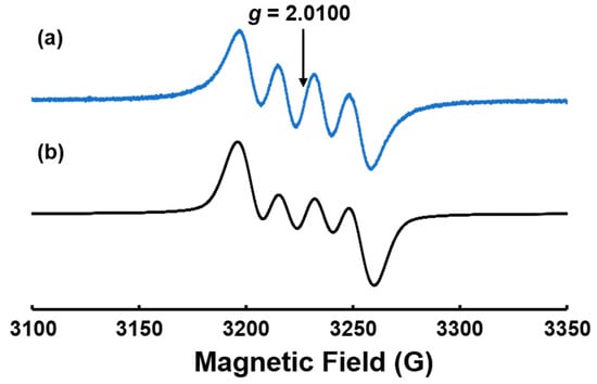 Electron spin resonance (ESR) measurements were conducted to confirm the formation of the radical species ClO2• under the present conditions in EtOAc. ClO2• was generated by combining a 1.0 M HCl solution in EtOAc with NaClO2 in EtOAc. Following the presence of solid residue, the supernatant was isolated and then diluted by a factor of 20. The ESR spectrum was obtained using the X-band and 298 K, revealing the characteristic isotropic signal at g = 2.010 with four hyperfine lines originating from the unpaired electron on the chlorine nucleus (I = 3/2 for 35Cl and 37Cl), as shown in Figure 2a. This confirms the production of ClO2• under these experimental conditions [20,21,22]. The hyperfine coupling constant and maximum slope line widths were determined from the simulated spectrum (Figure 2b) to be a(Cl) = 16.7 G and ΔHmsl = 14.7 G, respectively. In EtOAc, the observed g value of ClO2• differed from that reported in acetonitrile, emphasizing the impact of solvent polarity. In a more polar solvent such as acetonitrile, increased solvation and enhanced spin–orbit coupling cause a deviation of the g value from the free-electron value (g = 2.0023), resulting in a notably higher g value in acetonitrile compared to ethyl acetate.