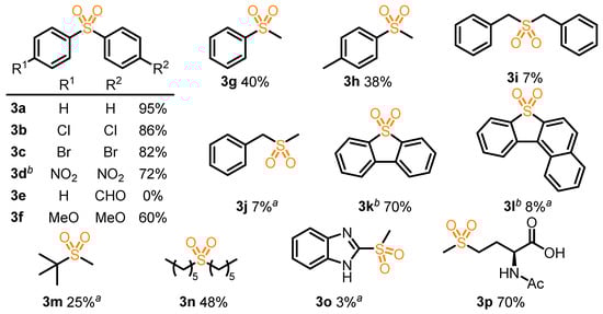 Scaling the reaction to 0.50 mmol under the optimized conditions (Table 1, entry 7) provided 3a in a 95% isolated yield (Figure 3). For comparison, the reaction using Bu4NClO2 under similar conditions has been reported to afford 3a in 95% yield [15]. Evaluation of the substrate scope showed that sulfides with p-halogen substituents (3b, 86%; 3c, 82%) were effectively oxidized. However, sulfides with p-nitro substitution required higher oxidant loading (6.3 equiv of NaClO2 and 5.0 equiv of HCl) to achieve complete conversion, affording 3d in a 72% yield. Sulfides with formyl substitutions underwent simultaneous oxidation at both the sulfide and formyl groups, hindering the isolation of the desired sulfone. Electron-donating groups like p-methoxy led to moderate yields (3f, 60%), while methyl-substituted sulfides showed lower efficiency (3g, 40%; 3h, 38%). Although other common oxidants often provide comparable yields for diphenyl sulfide, chlorine dioxide, being a radical species, preferentially reacts at positions that stabilize radical intermediates—such as benzylic or α-positions adjacent to heteroatoms—which can lead to side reactions and thus lower yields.