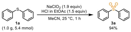 To a 6 mL screw vial, diphenyl sulfide 1a (93.1 mg, 0.50 mmol), sodium chlorite (105 mg, 0.95 mmol), MeCN (1.8 mL), and a solution of hydrogen chloride in ethyl acetate (750 μL, 0.75 mmol) were added. The mixture was stirred for 1 h at 25 °C. Subsequently, the mixture underwent purification by silica gel column chromatography using EtOAc as the eluent. After removal of the solvent under reduced pressure using a rotary evaporator, the desired product 3a was obtained as a white solid (104 mg, 0.48 mmol, 95% yield).