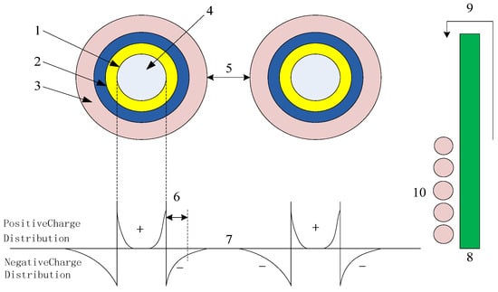 Multi-core model representing a nanocomposite incorporating spherical inorganic NPs within a polymer matrix. (1) Dense first layer, (2) second layer containing deep traps, (3) third layer containing large amounts of free volume, deep ion traps, and shallow electron traps, (4) NP, (5) interparticle distance, (6) Debye shielding distance, (7) NP overlap in the third layer, (8) charge accumulation at the nano filler on the electrode surface, (9) emission of thermoelectrons via the Schottky effect under a high electric field, and (10) changes in charge injection through the neutralizing effect.