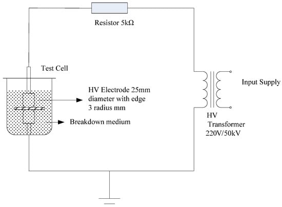 Although material insulation strength tests are generally performed in an actual operating medium, this medium can easily cause a flashover or intense discharge, leading to serious discrepancies in the test results. To prevent this, the entire electrode system was immersed in filtered cable oil as a liquid medium. More specifically, the cable oil was filtered through filter paper to give the pure medium use in the breakdown tests.