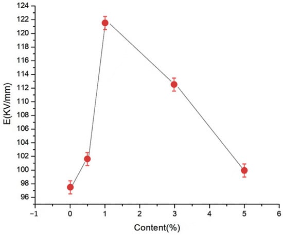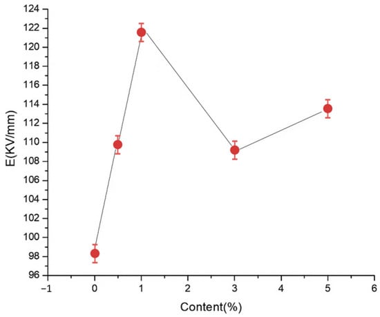 In a previous study, Mantarci et al. employed organically modified montmorillonite (O-MMT) to enhance the breakdown field strength of an O-MMT/EP composite. Upon the incorporation of 3% O-MMT, the highest breakdown field strength was reached, representing a 1.47-fold increase compared to that of the pure EP []. This was attributed to the material interface structure, trap quantity, and particle dispersion. In addition, Cheng et al. used different coupling agents to modify the surfaces of ZnO nanoparticles (NPs, ~40 nm diameter), and the corresponding nano-ZnO/LDPE materials were prepared using the melt blending approach. They found that the addition of ZnO NPs increased the breakdown field strength of the original LDPE. Following the modification of the ZnO NPs with the silane coupling agent KH570, the highest composite breakdown field strength was achieved with a ZnO loading of 3%, giving a value that was 11% higher than that of the pure LDPE. In another study, Long et al. subjected nano-MMT/LDPE composites to breakdown tests and found that the addition of nano-MMT NPs enhanced the breakdown strength of the original LDPE, giving the greatest effect at a nano-MMT loading of 3% []. Furthermore, Liu explored the effects of adding TiO2 and Al2O3 on the breakdown properties of fluorinated ethylene propylene (FEP) []. Upon increasing the TiO2 content, the breakdown strength of the nano-TiO2/FEP initially increased and then decreased. Moreover, Wang found that that the addition of nano-wollastonite enhanced the polymer breakdown strength of an impregnated varnish []. Further, Vinothkumar investigated the effects of different Al2O3 contents on the breakdown properties of Al2O3/polyimide (PI). It was found that an Al2O3 content of 5 wt% led to the greatest breakdown field strength for the Al2O3/PI composite []. Additionally, Hussain et al. explored the effects of different NPs on the dielectric strengths of PIs. At loadings <10 wt%, the addition of nano-SiO2 and nano-Al2O3 particles enhanced the dielectric strength of the pure PI. However, nano-BaTiO3, nano-SiC, nano-TiO2, and nano-ZnO particles led to reduced dielectric strengths due to the high dielectric constants and uneven distributions of the NPs [].