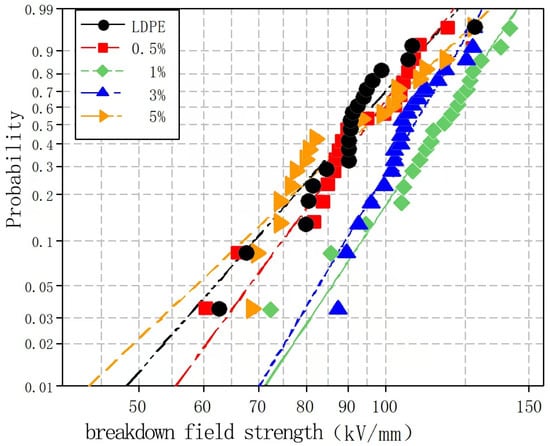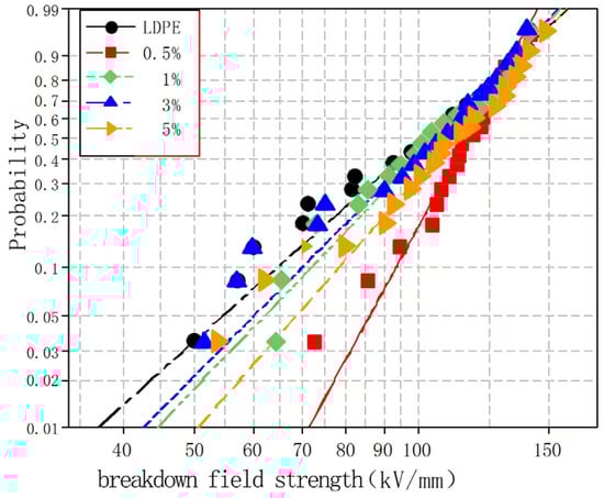 To explore the effects of different nano-MMT particle contents on the composite breakdown field strength, nano-MMT/LDPE specimens containing 0.5, 1, 3, and 5% MMT were subjected to a breakdown test. The experimental data were analyzed using the Weibull distribution, and the results are presented in Figure 4 and Figure 5.