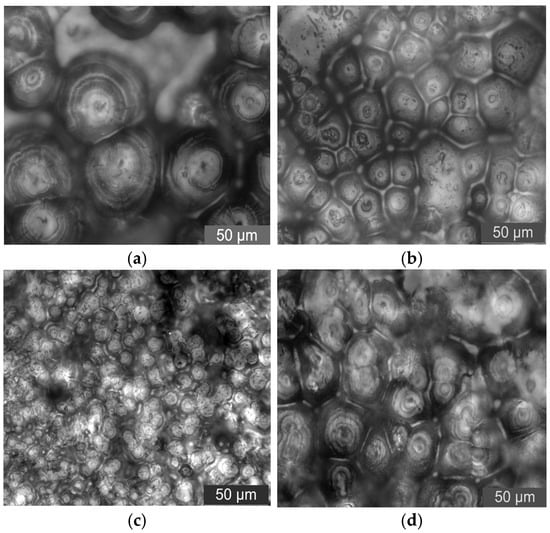 PLM patterns of nano-MgO/LDPE composites. (a) Pure LDPE. (b) PLM pattern of 0.5% MgO content sample. (c) PLM pattern of 1% MgO content sample. (d) PLM pattern of 3% MgO content sample.