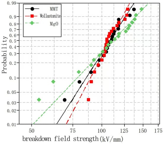 The breakdown tests were performed using nano-MMT/LDPE, nano-MgO/LDPE, and nano-wollastonite/LDPE samples containing additive loadings of 0, 0.5, 1, 3, and 5%. Each sample possessed a thickness of ~100 µm and was tested at 20 points to determine its average breakdown field strength. To eliminate internal electrical charges during the preparation process, the samples were initially subjected to a short-circuit treatment. Subsequently, these samples were heated at 80 °C in an oven for 12 h prior to cooling naturally to room temperature to eliminate the effects of stress during material mixing and composite preparation.