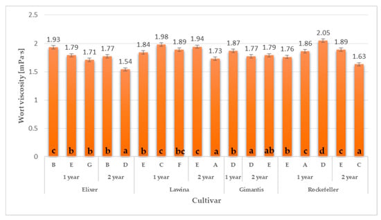 The lack of husk in the wheat grain and the high arabinoxylan content in the chemical composition not only affects the filtration time but also increases the viscosity of the obtained wheat worts [,,,,]. This parameter depends significantly on the wheat cultivar used [,]. The value of the wort viscosity parameter can be used as an indicator of the filtration process, and the lower its value, the lower the resistance of the liquid during flow []. According to Titze et al. [], wheat worts characterised by viscosities above 1.80 mPa·s are unacceptable to brewers, while according to authors Psota and Musilová [], this value should be up to 2.00 mPa·s.