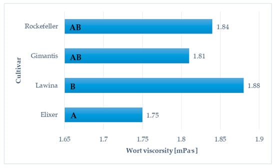 In studies by other authors, the average viscosity of wheat worts was 1.79 mPa·s [] and ranged from 1.687 to 2.314 mPa·s []. The viscosity of worts obtained from Croatian wheat cultivars was at an average level of 1.54 mPa·s [], for varying endosperm hardness and granulation, it was at a similar level (1.425 mPa·s; []). In a study by Belcar et al. [], five-day wheat malts obtained from wheat grains of the Elixer, Rockefeller and Gimantis cultivars had average viscosities of 2.47 mPa·s, 2.41 mPa·s and 1.80 mPa·s, respectively. In a study by Zhuang et al. [], the average viscosity of the wort obtained from 100% unmalted wheat grain was 1.79 mPa·s.