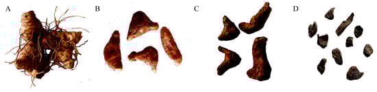 P. cyrtonema rhizomes with different steaming–drying processes: (A) 0 cycles; (B) 3 cycles; (C) 6 cycles; and (D) 9 cycles.