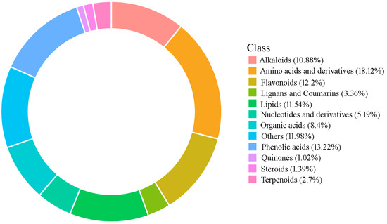 In order to ensure stability, 12 libraries for 4 groups of samples were constructed, including Tre-0, Tre-3, Tre-6, and Tre-9, which were subjected to zero, three, six, and nine cycles of steaming–drying, respectively (Figure 1). Based on UPLC-ESI-MS/MS analysis, a list of 1369 secondary metabolites were successfully identified, including 149 alkaloids, 167 flavonoids, 46 lignans and coumarins, 158 lipids, 14 quinones, 19 steroids, 37 terpenoids, 248 amino acids and derivatives, 71 nucleotide compounds, 115 organic acids, and 181 phenolic acids, as well as 164 other compounds including alcohols, aldehydes, chromones, ketones, saccharides, and vitamins (Table 1 and Table S1, Figure 2).