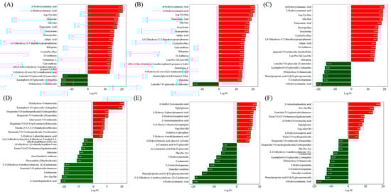 Bar chart of metabolites based on difference multiplier, with the X-axis representing log2FC values of metabolites and the Y-axis referring to differentially accumulated metabolites. The red and green colors refer to upregulation and downregulation, respectively. (A–F) referred to the ‘Tre-0’ Sample vs. ‘Tre-3’ Sample, ‘Tre-0’ Sample vs. ‘Tre-6’ Sample, ‘Tre-0’ Sample vs. ‘Tre-9’ Sample, ‘Tre-3’ Sample vs. ‘Tre-6’ Sample, ‘Tre-3’ Sample vs. ‘Tre-9’ Sample, and ‘Tre-6’ Sample vs. ‘Tre-6’ Sample, respectively.