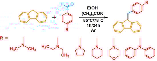 Positions 2 and 7 are often subjected to halogenation (bromination or iodination), and then to further reactions enabling the formation of the assumed derivatives [1,2,3]. In recent years, coupling reactions such as Suzuki, Sonogashira, and Buchwald–Hartwig have been very often used for this purpose [3,4,5,6,7,8,9]. Many reactions can also modify the 9-positions. In this case, a particularly interesting possibility is using the Knoevenagel condensation. This reaction allows the formation of a double bond at the 9-position of fluorene. Chemical compounds of this type are called dibenzofulvene derivatives (DBF) [10]. The second substrate necessary to carry out the aforementioned condensation is an aldehyde. Most often, aromatic or heteroaromatic aldehydes are used for this purpose, which allows the introduction of an additional substituent to the DBF structure that modifies the physicochemical properties of the final compound [10]. A wide selection of aromatic and heteroaromatic aldehydes available (even commercially) creates the possibility of obtaining an extremely wide group of dibenzofulvene derivatives. Moreover, the mentioned chemical compounds can be modified in positions 2 and 7, similar to fluorene [10]. Dibenzofulvene derivatives are becoming increasingly popular and not only because of their advantageous synthesis. Considering their attractive physicochemical properties, it is easy to indicate specific applications for which they have been studied in recent years. First of all, appropriately structurally modified dibenzofulvene derivatives are being studied for applications in solar cells [10,11,12,13,14,15,16,17,18,19,20,21]. In dye sensitized solar cells (DSSCs), dibenzofulvene derivatives are tested as organic dyes. Cells of this type using DBFs achieve an efficiency of up to 8% [10,11,12,13,21]. The second type of solar cells in which dibenzofulvene derivatives are studied are perovskite solar cells (PSCs) [10,14,15,16,17,18,19,20,21]. DBFs are tested as hole-transporting materials (HTM) in this type of cell. The considered PSC cells achieve efficiencies of up to 19–21% [10,14,15,16,17,18,19,20,21]. Interestingly, dibenzofulvene derivatives have been investigated as hole-transporting materials also in organic light-emitting diodes (OLEDs) [10,22]. Another important property of dibenzofulvene and its derivatives is the conjugated π-type bond system, which implies the ability of such compounds to undergo polymerization reactions under specific conditions. The polymerized DBF derivative is characterized by physicochemical properties, among which we can distinguish high thermal stability, high fluorescence efficiency, and appropriate charge transport [23,24,25,26,27,28,29,30,31]. These features are essential from the perspective of using dibenzofulvene derivatives in polymer light-emitting diodes (PLEDs) [10,23,25,32,33]. In addition, DBFs have been studied as highly efficient electrochromic materials capable of producing a wide range of colors [10,33].