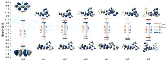 The energy gaps for the entire series of compounds have similar values, and one can also notice the regularity of the influence of amine substituents. Substituents that strongly affect the decrease in the Eox value (i.e., increase the electron density) simultaneously make the reduction more difficult. This behavior can be seen best by comparing compounds A-2 and A-6. The first undergoes oxidation at the lowest potential (0.18 V), while it is reduced at −2.17 V. In turn, A-6 is the opposite, i.e., it is most difficult to oxidize (at 0.42 V), while the reduction occurs the easiest of all the investigated molecules (at −2.02 V). Moreover, since the change of the substituent affects both processes and, thus, indirectly, the energies of the HOMO and LUMO orbitals, it means that both orbitals (at least partially) are overlapping (see also Section 2.3 DFT calculations). Moreover, comparing the energy gaps determined by the electrochemical method with those calculated from the UV–Vis spectrum, it can be seen that the latter is overestimated for the entire series by about 0.3 V (see Table 3). This is a relatively small value (the higher this value would be, the greater the difficulty of charge flow within the molecule).