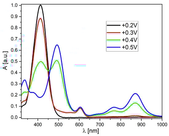 As mentioned earlier, the obtained derivatives show high stability of the oxidized forms. Therefore, a series of measurements using UV–Vis spectro-electrochemistry was performed (Figure 6 and Figure S23). Derivative A-2 was chosen as a representative example (Figure 6). This compound, in its neutral form, is characterized by one absorption band at the border of the visible range (peak maximum at 412 nm). This peak begins to disappear after exceeding the oxidation potential, while peaks appear and grow in the lower energy part of the spectrum. At a potential of +0.5 V, the highest value is obtained by the peak with a maximum at 492 nm. It is also worth noting the formation of a broad band covering the spectral region from 550 to 950 nm (with three local maxima). Such properties are similar to the properties of conducting polymers and result from the dispersion of positive charge within the conjugated system of double and single bonds. Therefore, this is a highly beneficial property from the point of view of further (potential) applications of the discussed group of compounds.