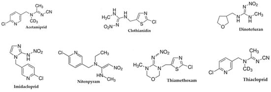 Acetamiprid, clothianidin, dinotefuran, imidacloprid, nitenpyram, thiacloprid, and thiamethoxam (PESTANAL®, analytical standard), as well as caffeine (purity ≥ 99%) were supplied from Sigma-Aldrich (St. Louis, MI, USA).