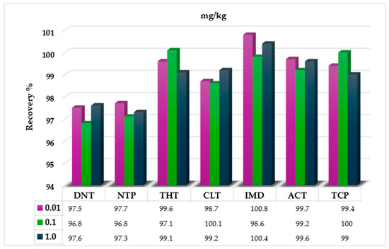 The method was developed to be compatible with equipment typically found in commodity laboratories and adhere to standard analysis times. It includes a user-friendly cleanup process using Strata®-X PRO (Phenomenex (Torrance, CA, USA)) cartridges that can efficiently remove interfering substances in just one step, requiring no special operating skills, followed by HPLC-DAD dosage. The method was validated to ensure the results’ traceability and reliability using the accuracy profile strategy proposed by the Société Française des Sciences et Techniques Pharmaceutiques Commission [29,30,31,32]. This validation approach has been previously positively applied to dose other pesticides such as glyphosate and glufosinate in many foods [33], aflatoxins in almonds [34], furan in apple puree and infant formula [35], and neonicotinoids in wheat [36] and Moroccan spearmint [37].