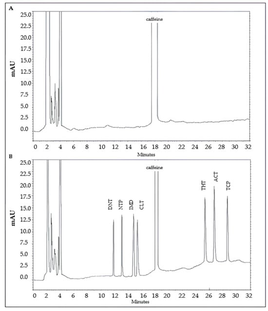 (A) HPLD-DAD chromatogram after extraction with STRATA XPRO cartridge of a blank green coffee sample; (B) chromatogram of a green coffee sample enriched with 0.1 mg/kg of a multicomponent solution containing the seven neonicotinoids examined (black line), including the caffeine peak.