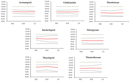 Accuracy profiles of the seven extracted neonicotinoids. The x-axis represents concentrations (mg/kg), while the y-axis indicates a recovery percentage. The dotted lines are the ±10% acceptance limits; the dashed lines are the upper and the lower 95% expectation tolerance limits; the red lines are the recovery yield (%).