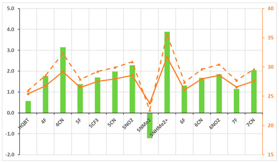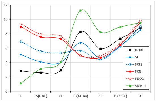 Bearing in mind that both KK and TS(KK-K) increase in energy upon electron-acceptor substitution, more detailed analysis is needed in respect of the aimed-for properties. Figure 2 shows the difference in relative stabilities of KK and K along with the height of the twisting barrier. Taking HQBT as a base for comparison, the implementation of electron-acceptor substituents leads to stabilization of K in respect to KK, providing conditions for clean switching from E to K. It is obvious that in most of the cases (except for some F substituents), the backward process of relaxation from K to E is expected to be substantially slower. Here, 5NHMe2+ could be considered as a border limit of decrease in basicity of the thiazolyl nitrogen atom (which leads to disappearance of KE) and increased rotor–stator conjugation in the intermediate keto forms, both caused by a single functional group. It should be noted that 5NHMe2+ is a computational chimera, because it is impossible to achieve this effect in practice by simple protonation of 5NMe2, where the quinolyl and thiazolyl nitrogen atoms have substantially higher electron densities and would be preferred as protonation sites. The figure illustrates the opposite direction of action in 5NMe2, where the implementation of the electron-donating substituent leads to stabilization of KK and relative destabilization of the K form in such a way that it cannot be populated.