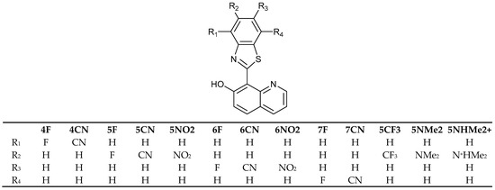 Following the detailed investigation of the mechanism of action of HQBT [68], structural modifications have been modeled to improve its performance by replacing the benzothiazole rotor by other heterocycles [71,72,73,74,75,76] or by using an external electric field as a trigger of switching [77]. No perfect solution has been found up to now. Therefore, in the current study we will discuss the molecular design based on various substitutions in the benzothiazole part of HQBT, as shown in Scheme 2. For this purpose, we will use the DFT/TDDFT protocol developed and validated by the experimental measurements and post-HF methods in [68]. The obtained theoretical results will be considered in the light of an overall discussion about the efficiency of switching in this class of compounds. As seen, a selection of electron-acceptor substituents with various electronic effects (F and CN) are considered on all possible positions, while the bulky substituents (NMe2, NO2 and CF3) are placed in a way (positions 5′ and 6′) that avoids either steric hindrance or the formation of additional intramolecular hydrogen bonding, which could affect the switching.
