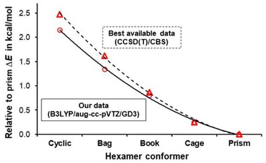 Three-dimensional density distribution varies with the level of theory to some degree; hence, somewhat different electronic energies (e-energies) are expected for each cluster. Our focus, however, is on trends in values of relative electronic energies of hexamers under investigation. As exemplified by the data in Table 1, the relative energies (ΔE = E(hexamer) – E(prism)) computed at a very high level of theory, namely CCSD(T)/CBS [64], compare very well with data obtained at somewhat lower levels, e.g., MP2(full)/aug-cc-pVTZ [65] and CCSD(T)/aug-cc-pVTZ [66].