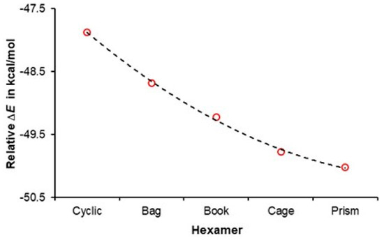 From the above, it follows that an n-membered water cluster should have lower electronic energy when compared with separate (non-interacting) n water molecules. A trend in Figure 3 shows that (i) all hexamers have much lower energy than six non-interacting water molecules, and (ii) all 3D hexamers are more stable than the cyclic homodromic ring. Moreover, a non-linear decrease in electronic energy reaches a minimum value for the prism, and this strongly suggests that the cooperativity phenomenon is strongest in this hexamer.