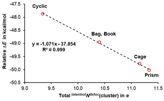 Relative to the E of six non-interacting water molecules, the trend in the decrease in E(cluster) plotted vs. the total number of electrons intermolecularly delocalized by all water molecules in the indicated hexamers. Regression for the fitted data (dashed line) is also indicated.