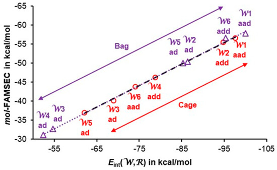Data pertaining to the bag hexamer are included in Table 3. The trends seen in the figures that follow were computed for the cage hexamer, as highly comparable indices were obtained for all 3D hexamers; relevant data obtained for book, cage and prism are in Table S1 in the Supplementary Materials. To ease interpretation, water molecules in Table 3 follow the order of their interaction energy with the remaining five waters, Eint(), from the most attractive (most negative) to the least attractive. It is immediately seen in Table 3 that water molecules with aad and add functionalities are involved in the strongest interactions with the remaining five waters in the cluster.