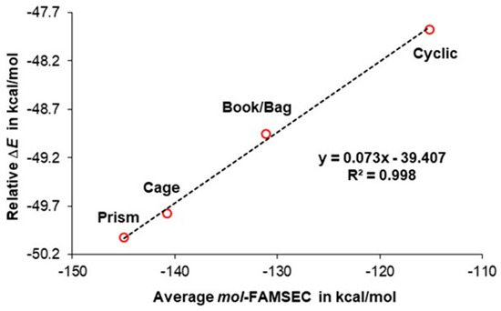 The above has demonstrated the importance of the VXC term in understanding water functionality and its cooperativity. There are, however, other energy components impacting the (in)stability of a system. The strongest evidence regarding individual water’s contribution to a cluster’s (in)stability, i.e., (anti)cooperativity, should come from the purposely derived energy term mol-FAMSEC. We found highly comparable trends between intermolNdeloc and VXC(), as well as between intermolNdeloc and mol-FAMSEC (see Figure S1 in the Supplementary Materials prepared for cage as an example). This is an important discovery, as it illustrates that there is a strong link between the total number of electrons delocalized by a water molecule throughout the space occupied by a 3D cluster (intermolNdeloc) and the quantifiable measure of energy contribution to the stability of a cluster made by a water molecule (mol-FAMSEC). Recall that the intermolNdeloc term is interpreted here as a principal driver and quantifiable measure of cooperativity. Furthermore, the data seen in Figure S1 in the Supplementary Materials suggest that there should be another important and nearly linear correlation between the quantum component of the interaction energy a water molecule is involved in with the remaining waters of a cluster, VXC() and mol-FAMSEC. Figure S2 in the Supplementary Materials shows that such a linear correlation indeed exists in the cage hexamer. Actually, we have established that high-quality linear correlation between VXC() and mol-FAMSEC exists for all 3D hexamers discussed in this work. In each case, the most significant mol-FAMSEC term is observed for water molecules with aad and add functionality in a specific cluster, and this strongly suggests that they are not involved in anticooperativity.