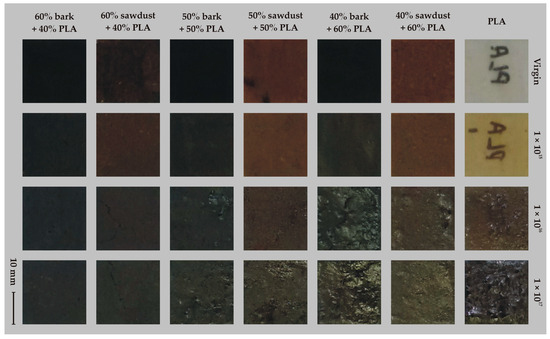 Figure 1 shows the visual surface characteristics of the implanted and control samples, highlighting the novelty and uniqueness of our research. The PLA samples, without lignocellulose doping, are semi-transparent, with a smooth surface and milky white color. The implantation of ions with a beam fluence of 1 × 1015 cm−2 causes the surface of the samples to remain semi-transparent but have an altered color. Larger values of ion fluence cause an apparent change in the color of the surface of the samples and their deformation. In the case of samples containing lignocellulosic particles, a similar trend in color changes is noticeable, but not as intense as in the control. An ion fluence of 1 × 1015 cm−2 does not cause apparent visual differences in surface quality compared to non-implanted samples, while higher doses of ion fluence cause a clear surface-darkening. In addition, it was found that with a higher proportion of PLA in the composite, the surface of the samples was more deformed. It was also noted in visual inspection that the type of cellulose particles determines the quality of the implanted surface. Based on visual signs, it was found that the surface of implanted composites containing bark particles was more deformed than the surface of composites containing wood particles. This phenomenon can be attributed to the chemical composition of the bark and wood, as well as to the geometry of the particles and their interaction in the PLA structure [18].
