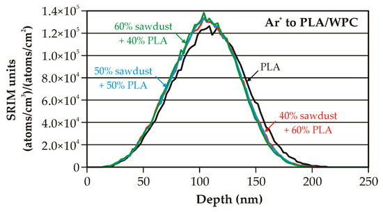The results of the computer modeling of the depth profiles for argon ions implanted on four different substrates are presented in Figure 2. The substrates were as follows: pure PLA, 40% sawdust + 60% PLA, 50% sawdust + 50% PLA, and 60% sawdust + 40% PLA.