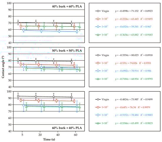 Figure 3, Figure 4 and Figure 5 illustrate the changes in wetting angle in WPC composites following argon ion implantation. The majority of cases show a positive effect, increasing the surface’s wettability. This finding holds significant potential for additional modification or finishing of WPC surfaces, offering the possibility of tailoring specific properties. It’s crucial to note the differences in wettability of the non-implanted samples. Composites with 60% added bark or sawdust exhibited a higher wetting angle and lower wettability than those with 40% lignocellulosic raw material (Figure 3 and Figure 4). This wettability was also lower than non-implanted PLA (Figure 5). As the content of lignocellulosic particles decreased, lower surface wettability was observed. The wetting angle of pure PLA was less than 80°, consistent with the literature data [20]. Both pure PLA and PLA–bark/sawdust composites absorb water, as evidenced by a decrease in the wetting angle at 60 s.