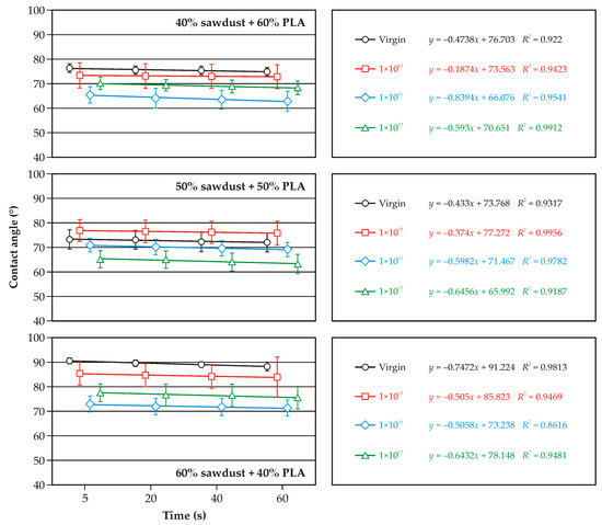 Variations in the surface wetting angle of PLA and sawdust-based WPC composites with ion implantation.