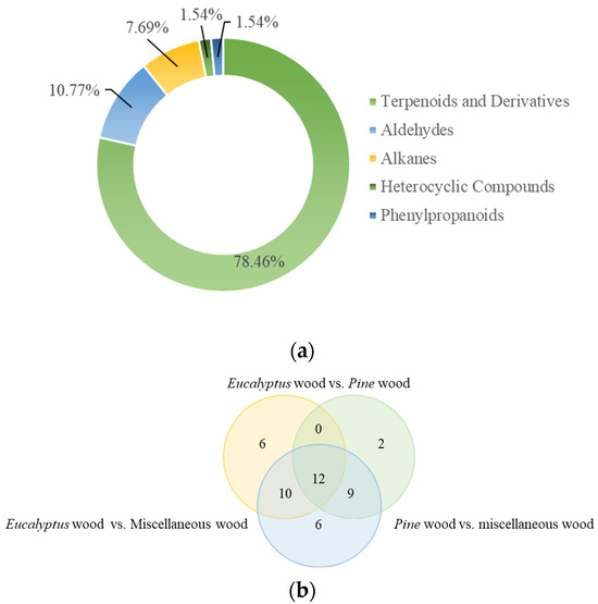 VOCs detected in Eucalyptus particleboard: (a) classification and (b) Venn diagram.